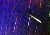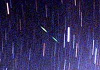 A 15 minute exposure with a Nikon F3 / 16mm lens at f2.8 on Fuji 200 asa color film. Three meteors are visible in the frame photographed at about 10:15 p.m. CDT, August 11th, 1998 on the grounds of Powell Gardens, located 35 miles east of Kansas City, Missouri, USA. A bright -1 mag meteor can be seen on the far right edge of the frame. The smaller twin, -1 mag meteors in the upper middle of the frame were seen within 30 seconds of each other. The pole star Polaris can be seen at the left for reference. (C)1998 Vic Winter/ICSTARS Astronomy.