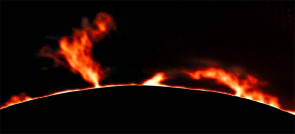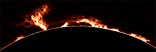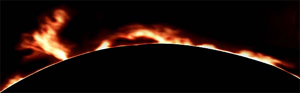 Photographed with Kodak Tech-Pan 2415 black & white film and a prototype prominence hydrogen alpha filter, a large active prominence dominates this limb of the solar disk on the afternoon of February 19th, 2001. These photos were taken between 22:30 UT and 23:30 UT.