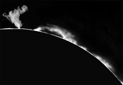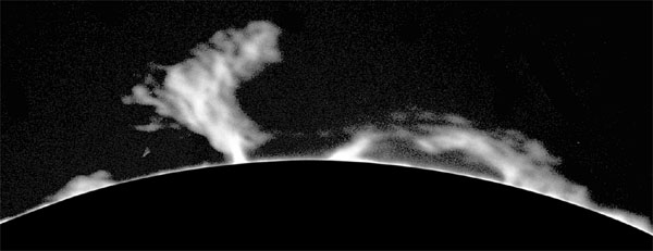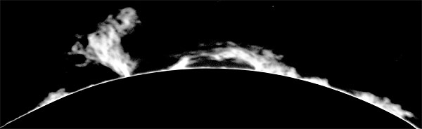 Photographed with Kodak Tech-Pan 2415 black & white film and a prototype prominence hydrogen alpha filter, a large active prominence dominates this limb of the solar disk on the afternoon of February 19th, 2001. These photos were taken between 22:30 UT and 23:30 UT.