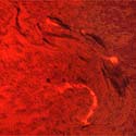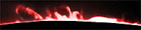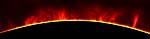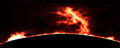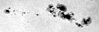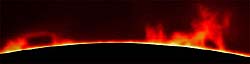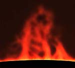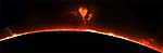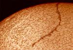 Photographed with rear-mounted DayStar Filter with custom "YellowScope" dedicated solar telescope.  Configured with RG610 Red glass 4.75" F/15 objective, 2X barlow and 35mm camera mounted prime focus at approximately 3600mm EFL. Using Kodak Technical Pan film, developed with Rodinol, scanned in monochrome, then colorized.