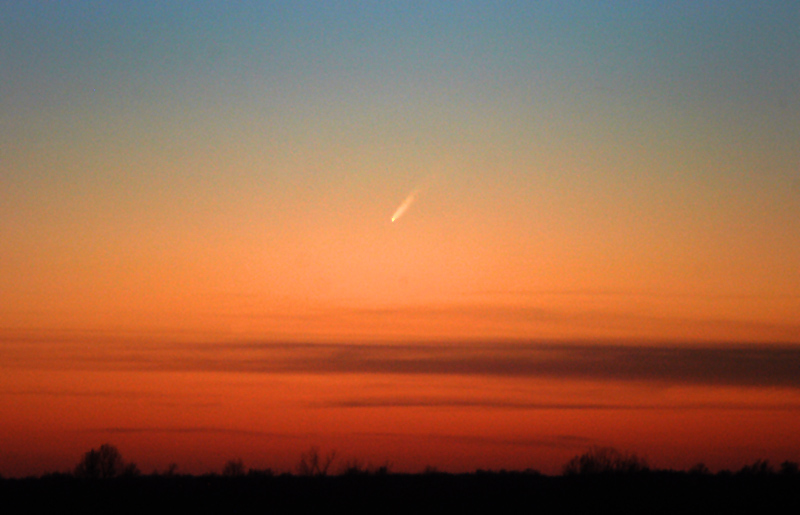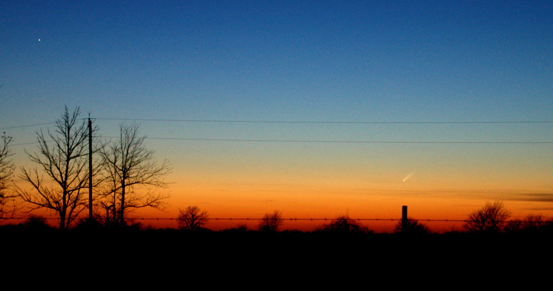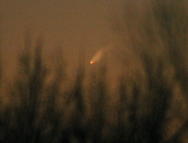 Into The Trees: The comet quickly dropped into the trees as twilight started to fade. Photographed with a Nikon D100 camera at asa 1000 with a 600mm lens at f4.5 / 80th of a second. Photographed at 5:40 p.m. cst from the ICASTARS Ranch, northwest of Warrensburg, Missouri USA on the evening of January 9th, 2007. Photo (C)2007 by Vic Winter/ICSTARS Astronomy