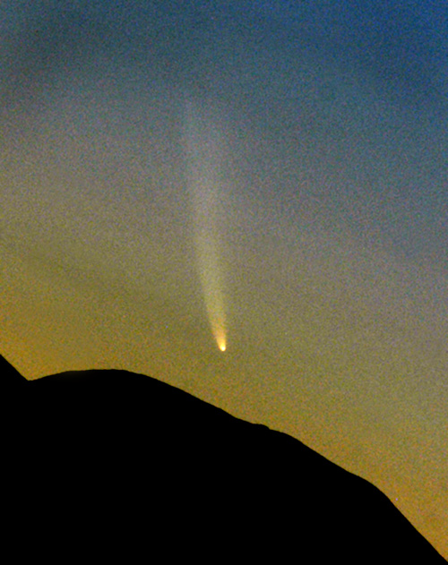 Comet McNaughtt's tail grew even longer and brighter when viewed close up with a long telephoto lens. The comet was photographed with a Nikon D100 camera at asa 800 with a 600mm lens at f4 / 15th of a second. The image was taken at 5:44 p.m. cst from a hill just west of the ICASTARS Ranch, northwest of Warrensburg, Missouri USA. just before it set into a thin layer of clouds about one degree above the western horizon. Photo (C)2007 by Vic Winter/ICSTARS Astronomy